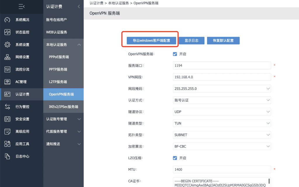 认证计费–>本地认证服务–>OpenVPN服务端–>导出windows客户端配置