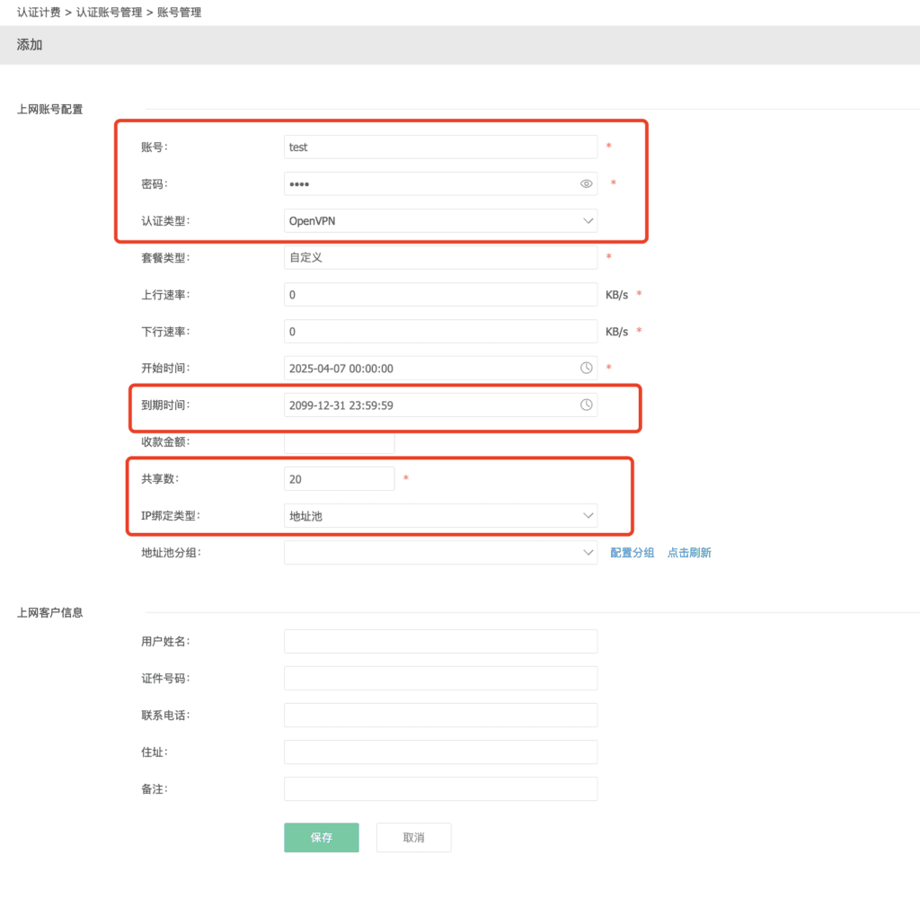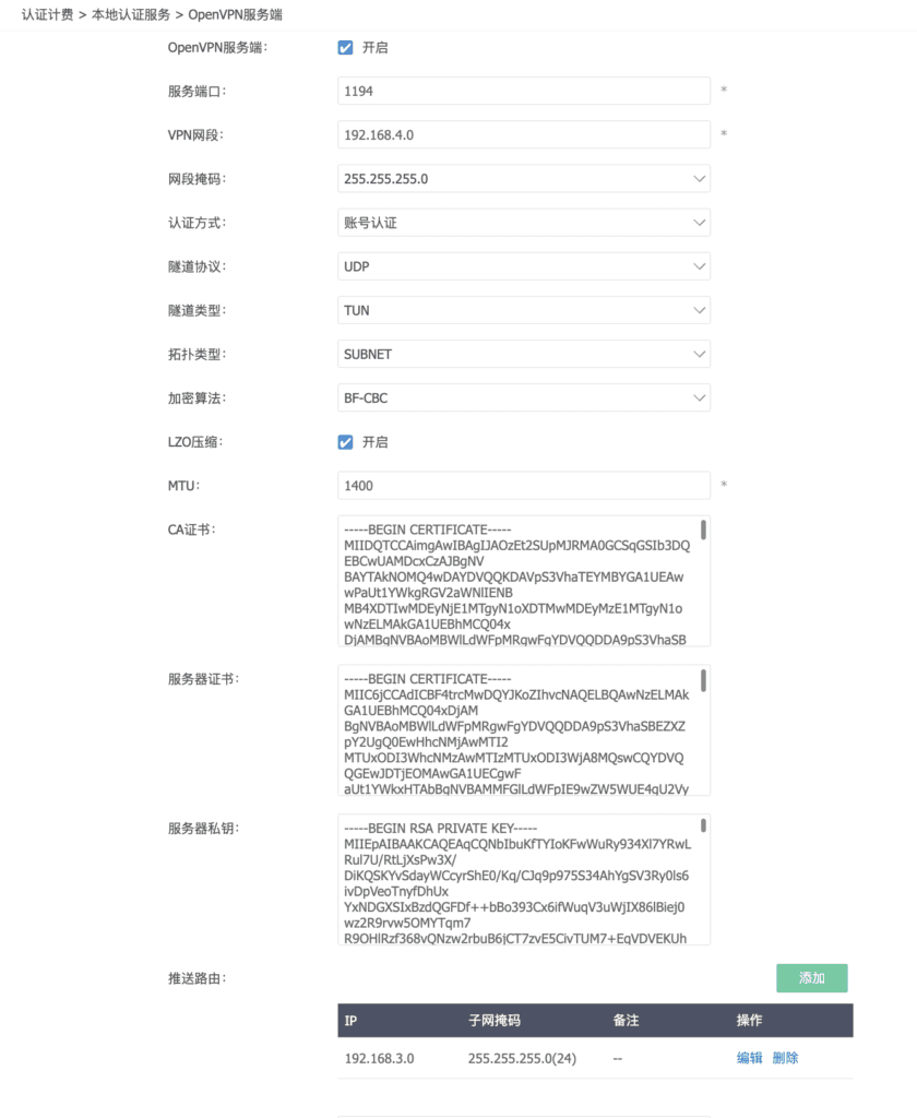 认证计费–>本地认证服务–>OpenVPN服务端,OpenVPN服务端勾选开启